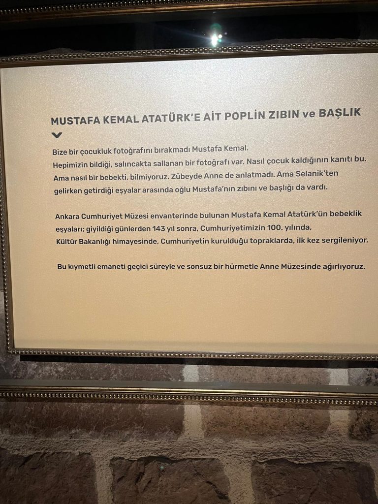 Ulu Önder gazi Mustafa Kemal Atatürk’ün bebeklik zıbını, başlığı ve annesi Zübeyde Hanım’ın seccadesi o dönemdeki anne figürünün ne kadar meşakkatli, ne kadar yorucu ve özverili olduğunu aktarır niteliktedir.
